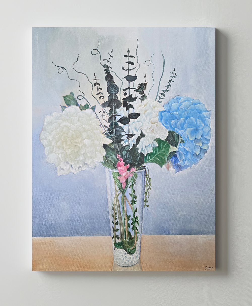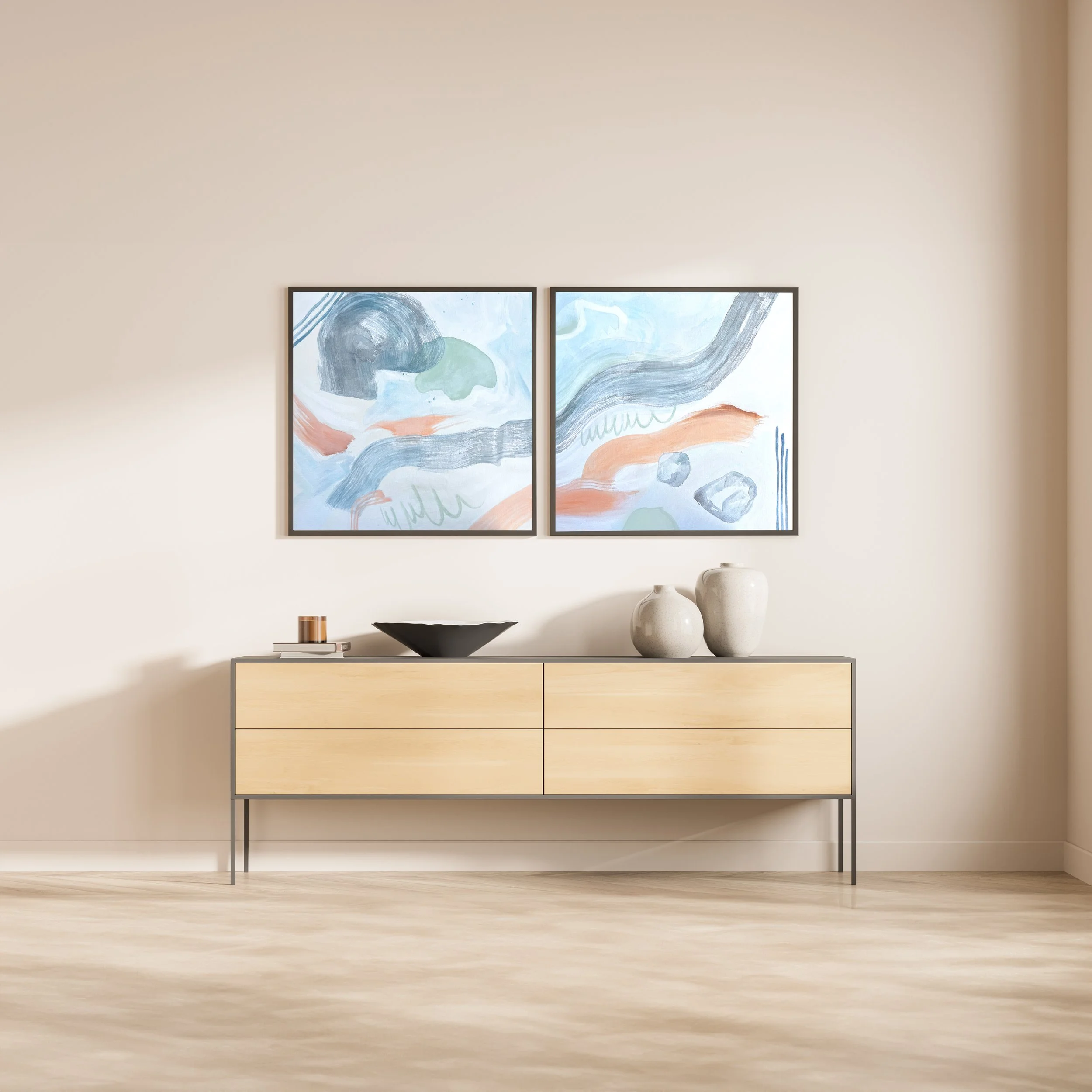 This exhibition marks a meaningful moment for both of us. While my father and I have developed distinct artistic voices over the years, seeing our work presented side by side reveals an undeniable connection. There is a shared sensibility in our approach to color, composition, and atmosphere—most notably in a palette of soft blues, greens, and warm neutrals that quietly echoes across both bodies of work.